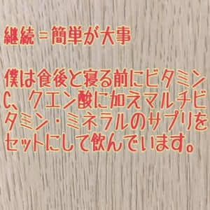 身体の仕組みから行くとビタミンCはビタミンEと、クエン酸はビタミンB群と一緒に摂ると更に効果がアップするのですが、全部取り入れていくとキリがないで、マルチビタミン・ミネラルを僕は飲んでいます。
