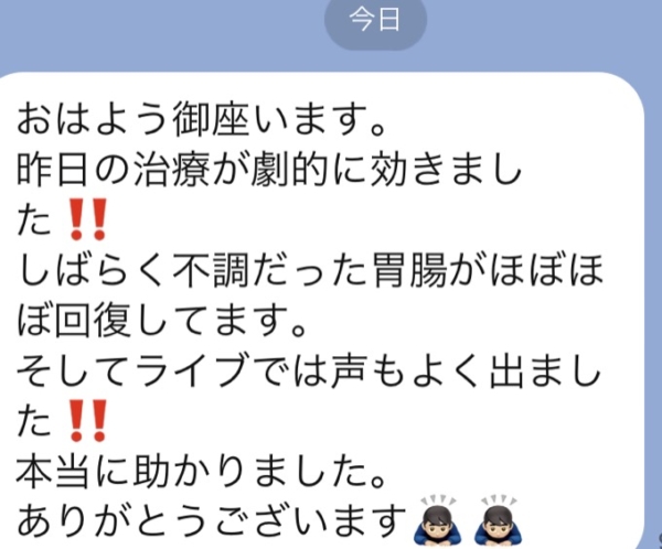 ライブ前とライブ後での施術で「体が軽くなった!」とのこと、これからのツアーに向けて体調キープのお手伝いができてよかったです。