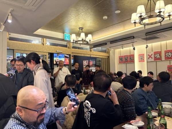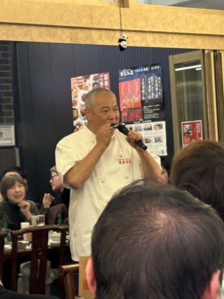 最初に店主が開始のご挨拶。70人集まっている中、我々は4人で。手前の人はうちらの仲間ですw
