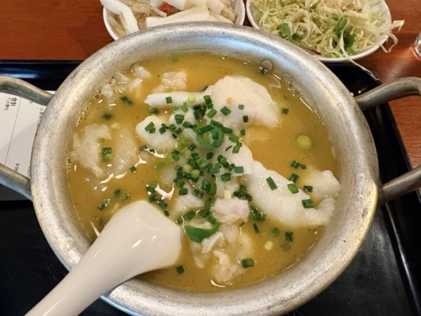 酸菜魚。2025年12月現在980円。ライスとサラダ、もやしナムル、大根の浅漬けみたいなやつが食べ放題。お得!白身魚の量も半端ないので満足度は高い!